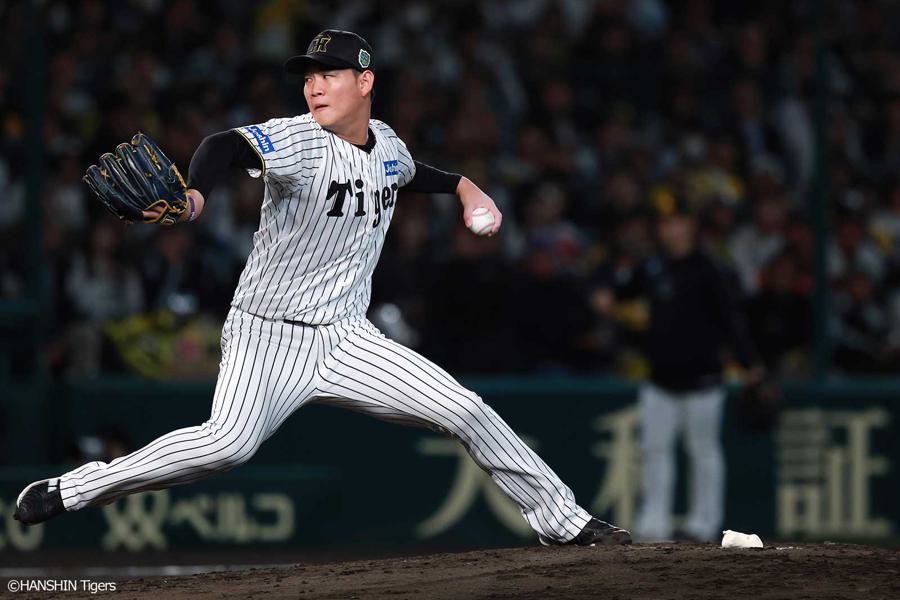 好調の佐藤輝が難敵・モイネロのカーブを鋭く弾き返す。